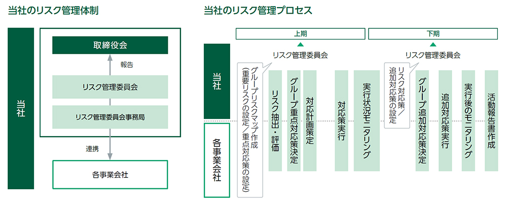 当社は、当社グループのリスク管理体制の維持・向上を図るためリスク管理委員会を設置しています。リスク管理委員会はグループ経営上重要なリスクの抽出・評価を行い、重点対応策を決定し、重点対応策の実行状況のモニタリングを定期的に行い、その結果についてESG委員会を通じて取締役会へ報告を行っています。なお2025年3月期はリスク管理委員会を2回開催し、重要なリスクについて前年度との比較・評価を行い重点対応策について協議しました。