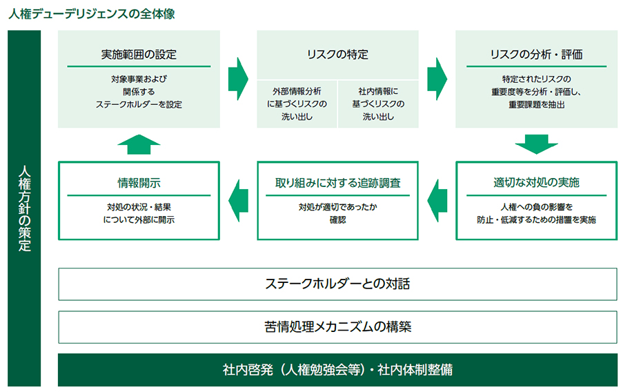 2024年にもすでにサプライヤーデューディリジェンスの一環として、人権デューデリジェンスを実施し、「グループ子会社における労働者の環境」、「仕入れ先における労働者の環境」、「業務委託先における労働者の環境(ドライバーの労働環境含む)」の三点を重要な人権テーマとして特定しました。これらは、社内ヒアリングで提起された課題のうち、潜在的リスクが高く、社会に及ぼす負の影響が大きいと第三者機関と抽出したテーマです。2024年3月期にグループ会社に対して実施した人権デューデリジェンスでは大きな人権課題は見られず、経営層も課題として上がった事項を認識しているということが確認できました。また、2025年には国内子会社の海外における生産拠点を対象にデューデリジェンスを進め、問題が見受けられないことを確認しました。
