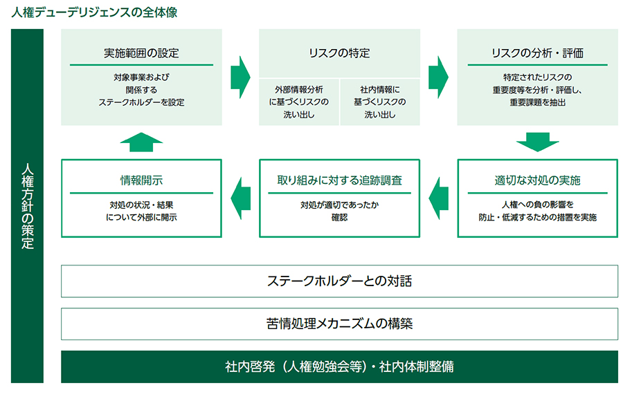 KPPグループは、国連「ビジネスと人権に関する指導原則」に則した人権デュー・ディリジェンスの仕組みを構築し、KPPグループがステークホルダーに与える人権への負の影響を特定し、その防止および軽減を図ります。