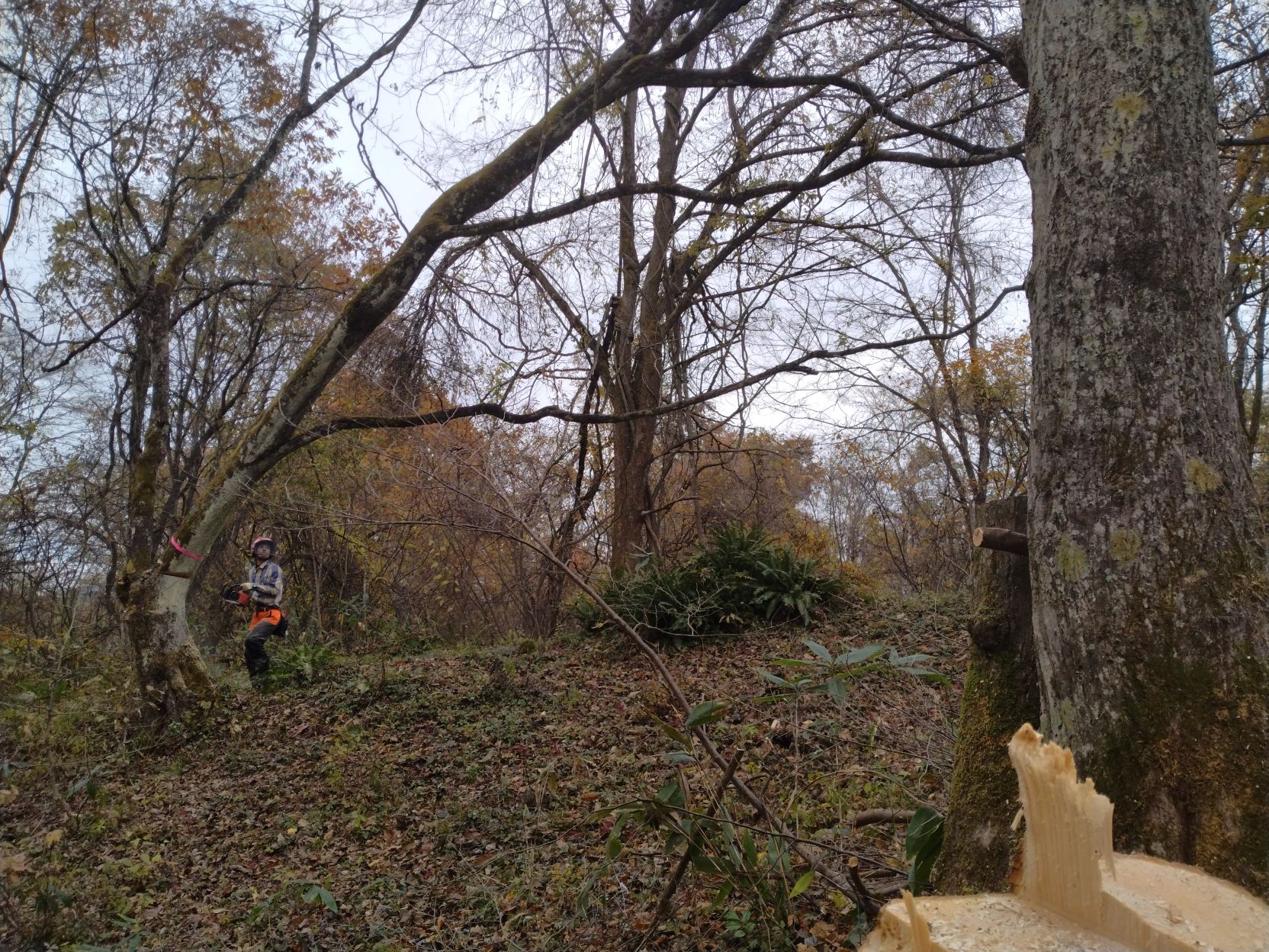伐採作業は、秋から冬までの短い間に行います。葉が落ち、木が水あげもやめる、冬の眠ったような状態の時に伐採することで、木の重量が軽くなり、作業の負担が少なくなるという、昔からの森の知恵です。