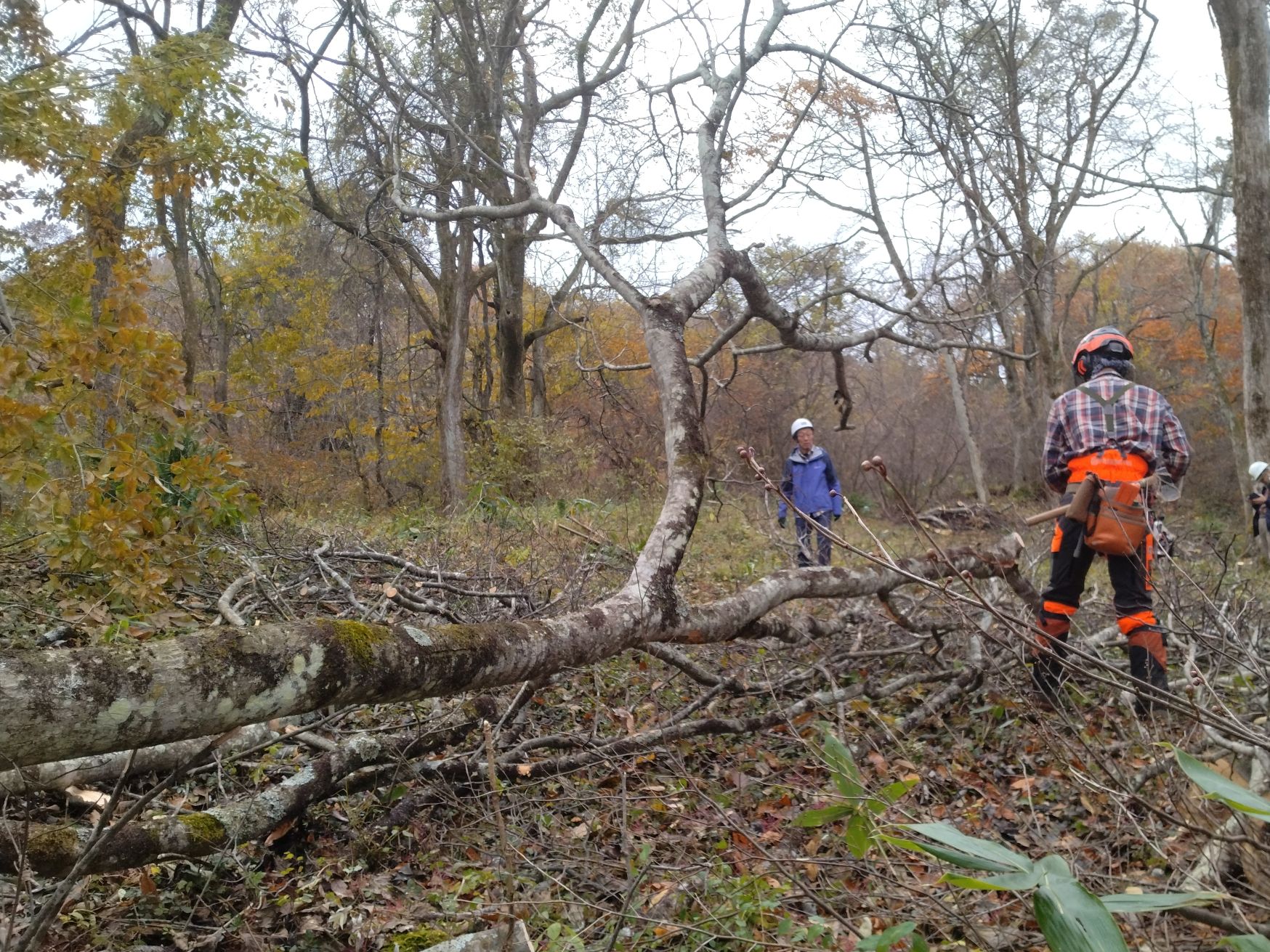 今回は初めて、{整理伐}^{せいりばつ}と呼ばれる大規模な伐採作業を行いました。整理伐とは、傷ついたり、形がいびつだったり、他の木の成長を妨げたりしている木を伐採し、森の風通しや日当たりを良くする作業です。そうすることで、より多くの種類の植物が生育できるようになります。