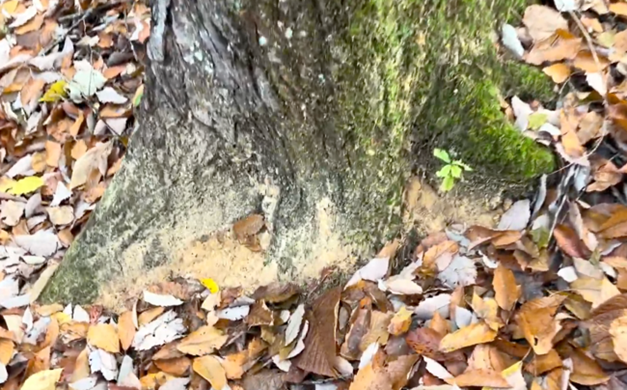 また、感染した木の根元には、虫が木の中へ入っていく際に生じる木くずやふんが見られます。