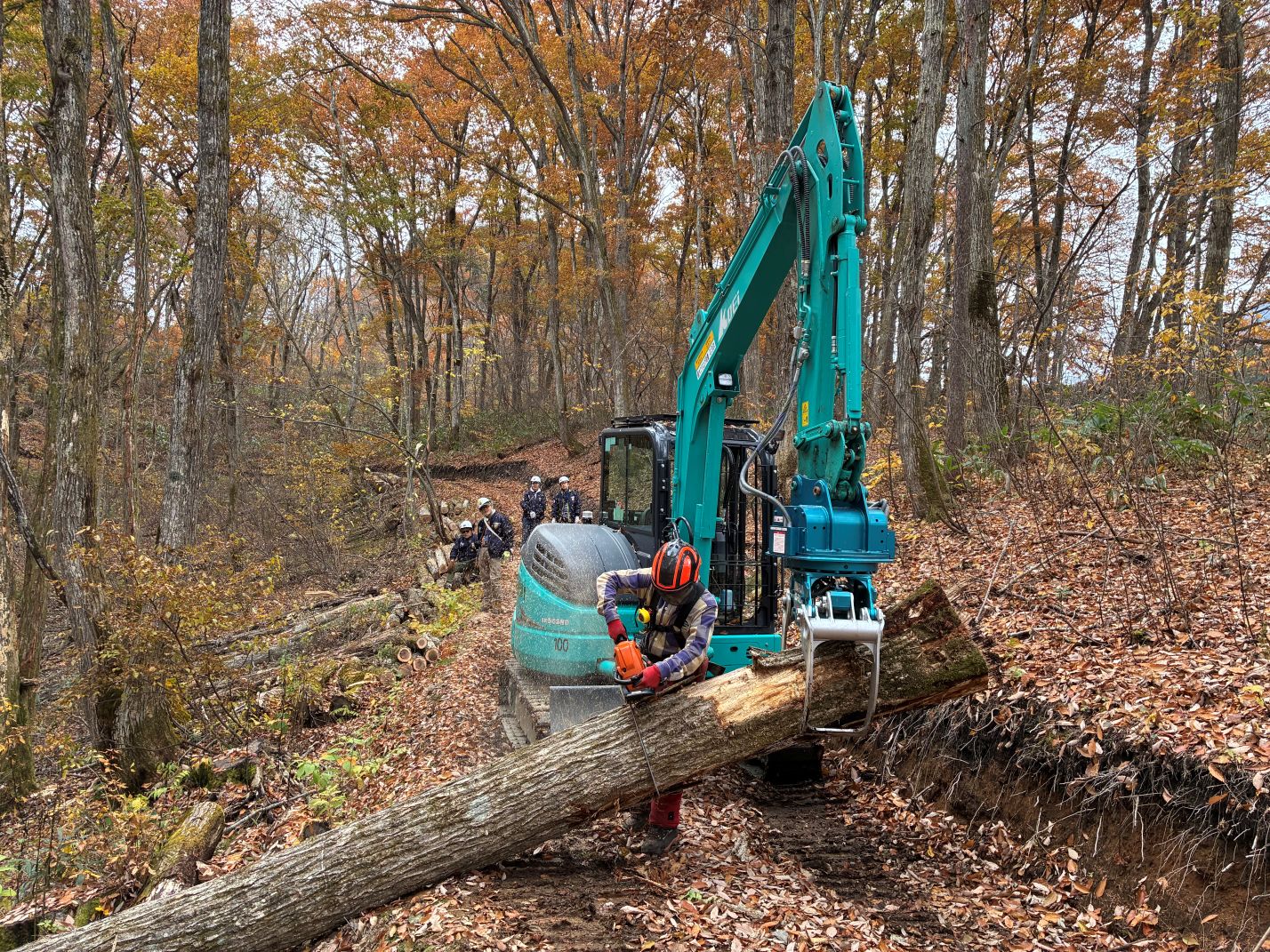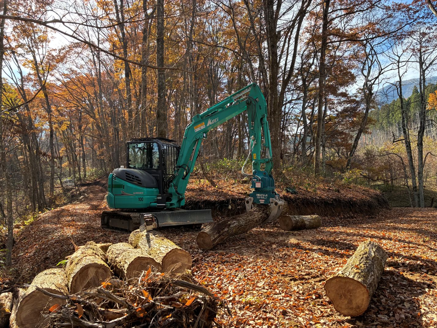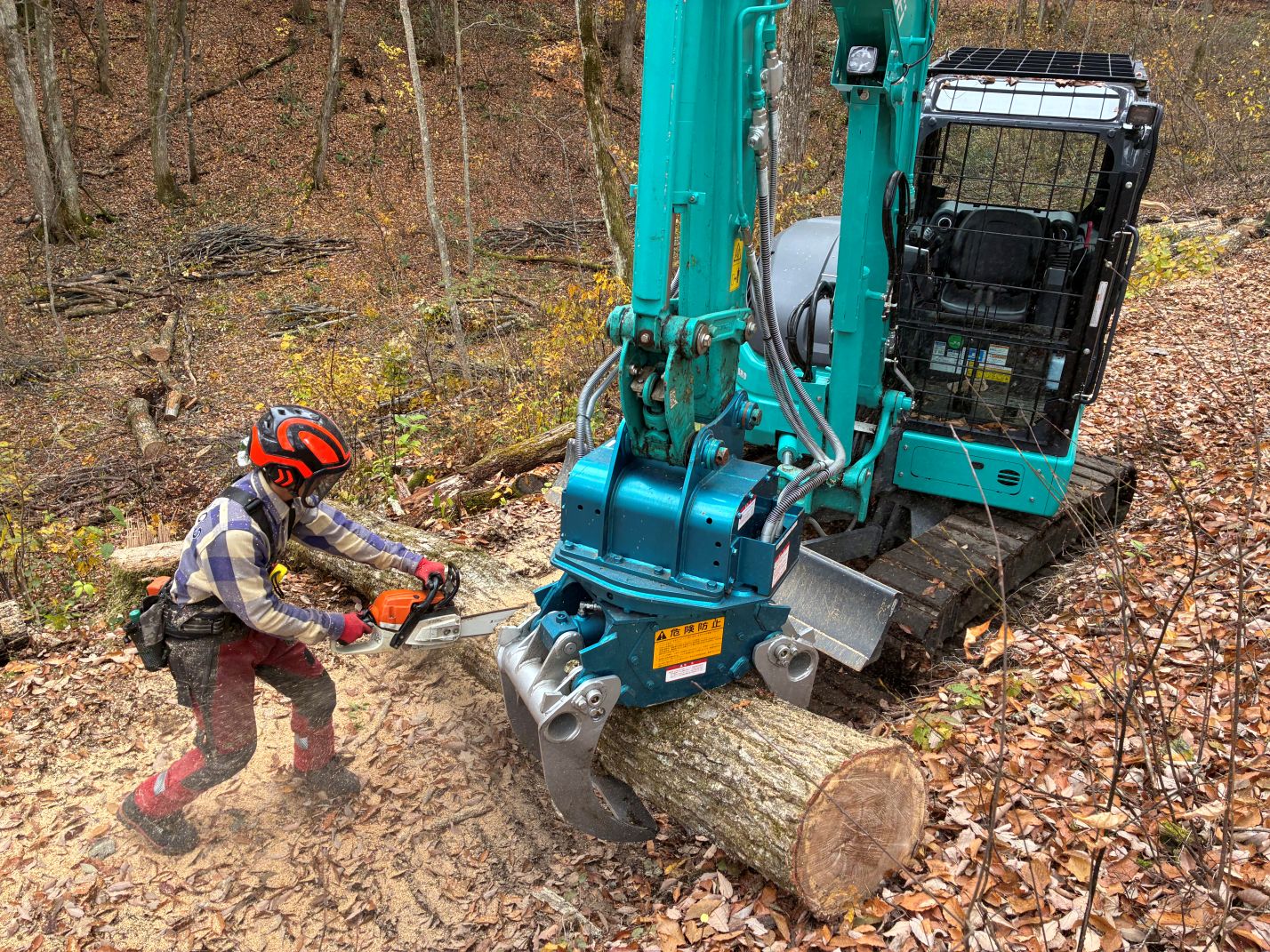 伐採するのは樹齢の高い大木が多いため、グラップルと呼ばれる木を掴むことができる 重機を使用しました。