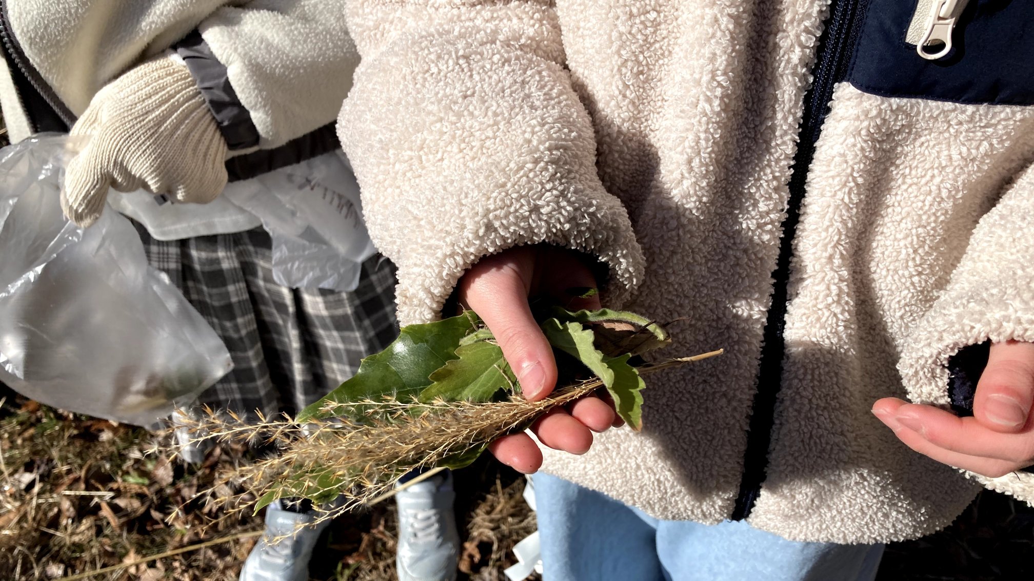 ここで一度、和紙の水が切れるのを待ちながら、学校の裏手にある復興の森で、作品用の素材を集めに行きます。子どもたちにとって普段から見慣れた森でも、素材を探す目で自然を観察することで、新しい発見があります。