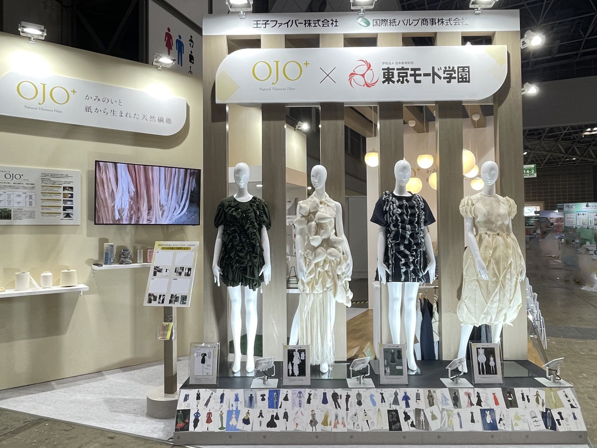 KPPグループホールディングスのグループ会社である国際紙パルプ商事株式会社(本社:東京都中央区、代表取締役 社長執行役員:小馬井 秀臣、以下 当社)と王子ファイバー株式会社(本社:東京都中央区、代表取締役社長:平井 雅一)は、東京モード学園との産学連携プロジェクトの一環として、紙で作られた天然繊維「かみのいとOJO⁺」を使って制作された同学園の学生による作品を、2025年10月1日~3日開催の「Faw TOKYO 第16回ファッションワールド東京 秋」で初展示しました。