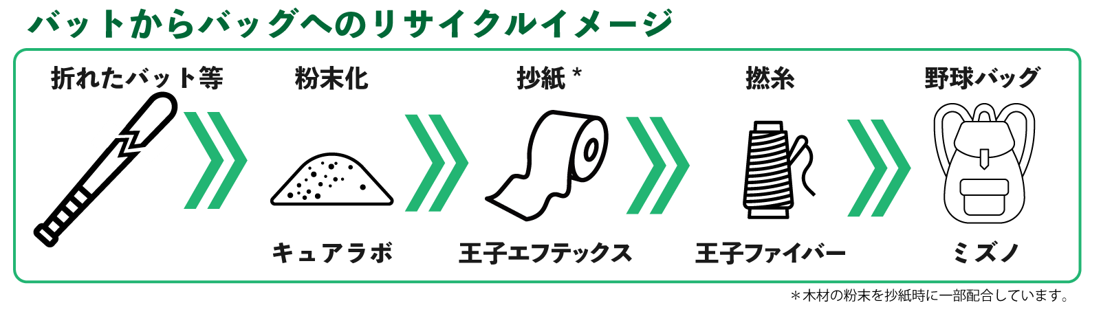 KPPグループホールディングスのグループ会社である王子ファイバー株式会社(本社:東京都中央区、代表取締役社長:平井 雅一 以下、当社)は、総合スポーツ用品メーカーのミズノ株式会社(本社:大阪府大阪市、代表取締役社長:水野 明人)、キュアラボ株式会社(本社:沖縄県浦添市、代表取締役社長:山本 直人)、王子エフテックス株式会社(本社:東京都中央区、代表取締役社長:安井 宏和)と協業し、プロ野球選手が使用した木製バットをリサイクルした紙糸素材を開発しました。本素材で作られた野球バッグが、ミズノ契約のトップチーム向けの取り組みで使用される予定です。