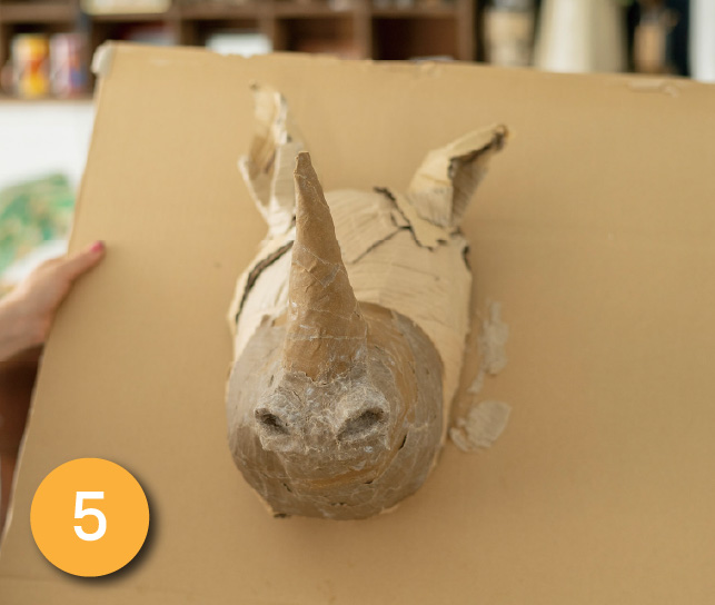 「段ボールを曲げたり潰したりして柔らかくもみほぐした段ボールで、大まかな形を制作します。それとは別に、タライに張った水に浸して表と裏を覆う平らな紙と波型の中芯を剥がしていきます。剥がした紙をちぎってそのまま貼ったり、ボンドと混ぜて粘土状にしたものを造形したりして、段ボールの型に何層にも継ぎはぎするように貼り付けていきます」(玉田さん)。