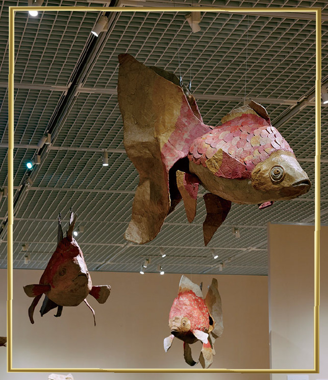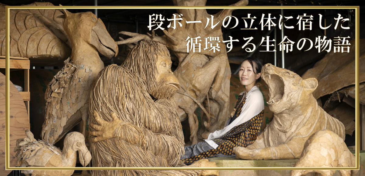 愛らしくも力強さを感じる野生動物たち。それぞれの豊かな表情やしぐさには、息づかいが聞こえてくるほどの生命力を感じます。この塑像※にも見える作品に用いられているのは、梱包材として使用された段ボール。玉田多紀さんは、段ボールという身近な素材に独自の造形技法を加えることで、観る人の心を惹きつけるアート作品として再生する造形作家です。素材の循環と生命の再生を重ね合わせた作品には、人間社会の未来に向けた、言葉なきメッセージが含まれています。
