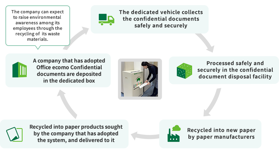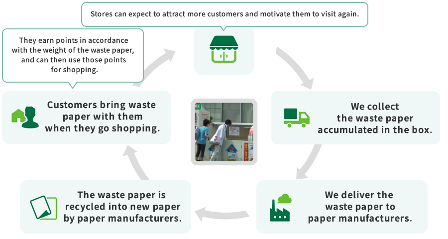 Recovered paper is a recycled resource that is used as an ingredient of paper. Recovered paper from offices and households is collected, brought to paper manufacturers, and recycled into paper again. This system is aimed at using valuable resources efficiently, thereby reducing the environmental impact.