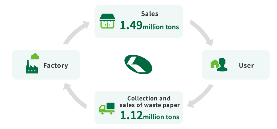 Kokusai Pulp & Paper Co., Ltd. is at the center of this recycling system. While we sell approximately 2.2 million tons of paper every year, we are also involved in the collection and sales of approximately 1.4 million tons of recovered paper. This volume is at the highest level among paper and pulp trading companies in Japan. This is another main business of Kokusai Pulp & Paper Co., Ltd. We undertake business to expand this circle of recycling under our Management Philosophy of “achieving a recycling-oriented society.”