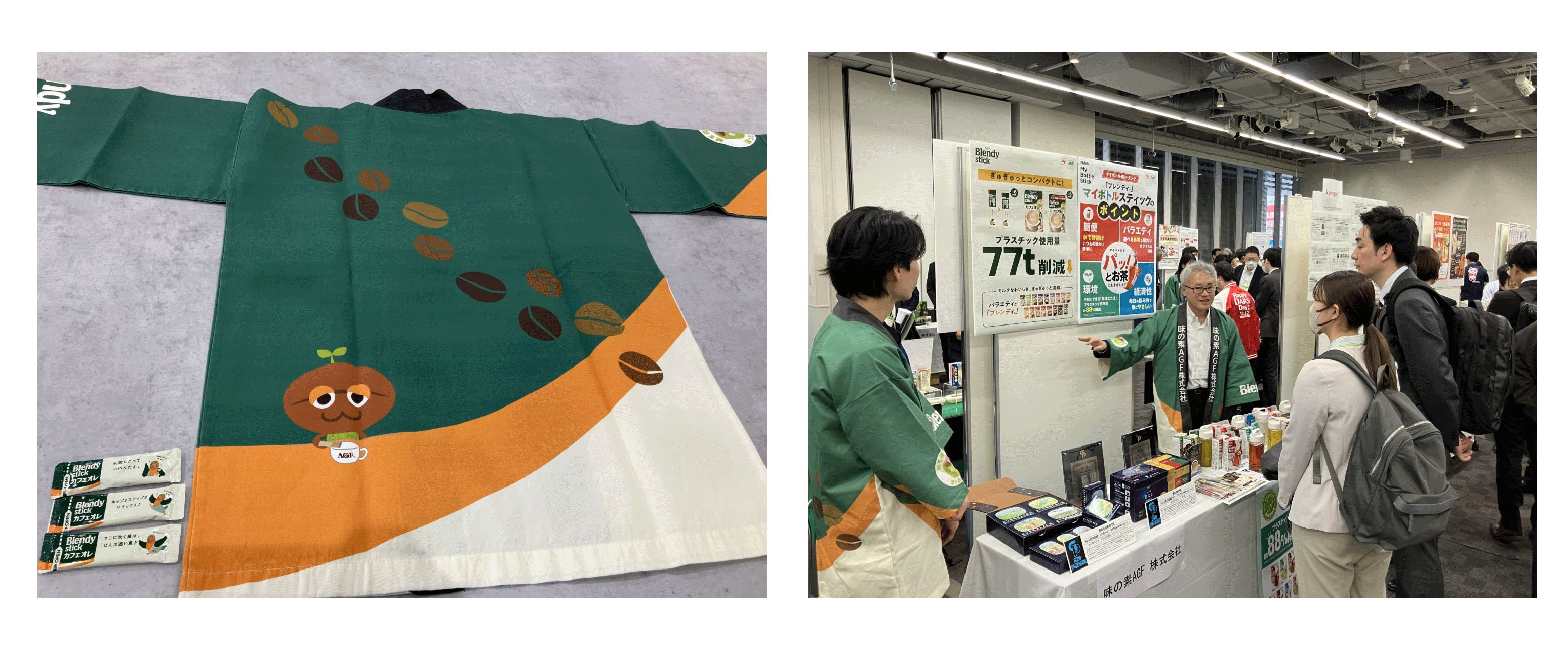 本法被は、展示会や社内外の発表会など、さまざまな場面で着用されており、味の素AGFの環境への取り組みを伝える象徴的なアイテムとして活用されています。パッと目を引くデザイン性に加え、「紙の糸」という素材そのものが話題性を生み、来場者との自然なコミュニケーションを促すツールとしても注目を集めています。