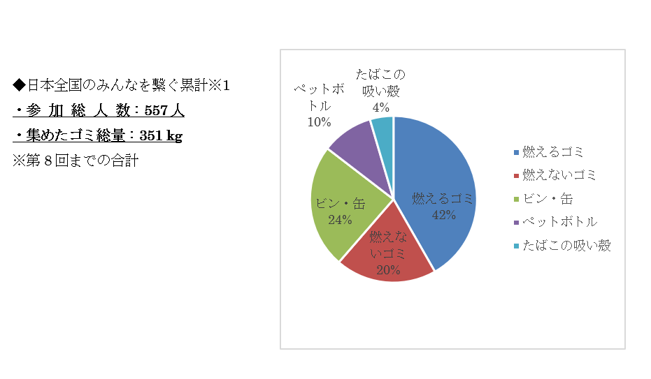 第1回の北海道開催を皮切りに、今回の大阪府開催は第9回目となります。これまでの参加総人数は557人、集めたゴミの総量は351kg※1となりました。小さなお子さんからご年配の方まで幅広い層の方たちにご参加いただいています。日本をキレイに、そして日本全国のみんなを繋ぐ一大プロジェクトです。2023年12月までに全国10都市で開催する予定で、残すところ2大会となりました。