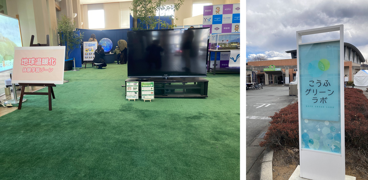 OJO⁺ペーパーターフが敷かれた同ラボでは、地球温暖化対策として、燃焼反応時に温室効果ガスが生じない水素エネルギーの普及啓発や、家庭から出るごみを減らして焼却時の温室効果ガスを減らす重要性について展示パネルや映像で説明しています。市内の環境教育の拠点となる同ラボと、天然繊維から作られたOJO⁺ペーパーターフの親和性が評価されて敷設に至りました。