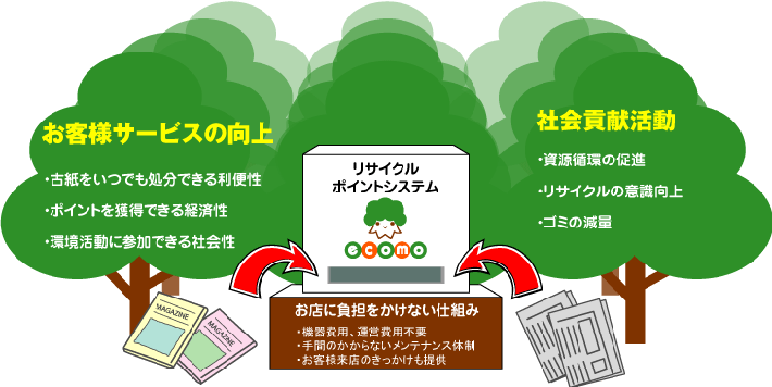 お客様サービスの向上と社会貢献活動を、お店に負担をかけずに実現する仕組みです。