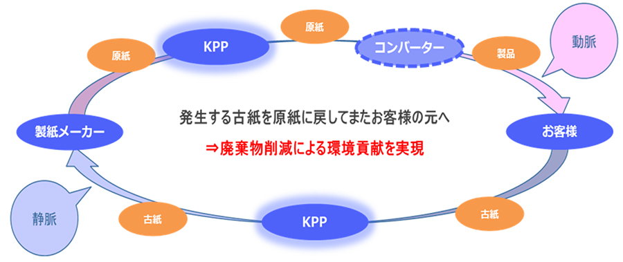 このような動きの中で、当社は原紙供給という「動脈」と古紙回収という「静脈」を一元管理することで、発生する古紙を原紙へ戻し、お客様に再度利用していただくという資源循環のリサイクルループの実現・見える化をサポートします。そして、お客様の環境活動に寄与し、持続可能な循環型社会の実現に貢献していきます。