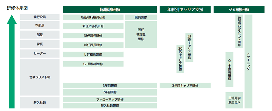 若手から中堅社員までの各ステージに応じたビジネススキル研修や昇格時研修を行っています。ほかにもエンゲージメントサーベイの結果を踏まえ、上司と部下の対